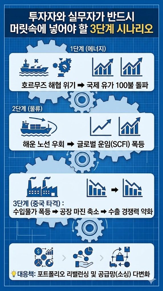 - 공장 가동의 도미노 타격: 유가 폭등은 곧 중국 내 전력 생산 단가와 공장 가동 비용의 급증을 의미합니다. 이는 제조업 기반의 중국 경제에 **'수입물가 상승(인플레이션) → 기업 마진 축소 → 수출 경쟁력 하락'**이라는 최악의 스태그플레이션 사이클을 닥치게 합니다.