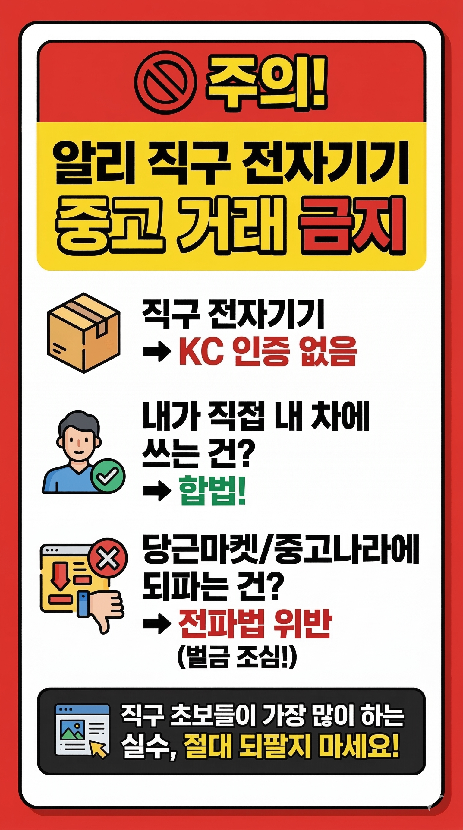 - 중고 거래 절대 금지: 알리에서 직구한 전자기기(블루투스 동글, 무선 청소기 등)는 한국의 전파인증(KC)을 받지 않은 제품입니다. 개인이 본인 차에서 직접 사용하는 것은 100% 합법이지만, 쓰다가 질렸다고 당근마켓이나 중고나라에 돈을 받고 되파는 순간 전파법 위반으로 벌금을 물 수 있습니다. 반드시 '개인 사용 목적'으로만 구매하고 폐기하셔야 합니다.