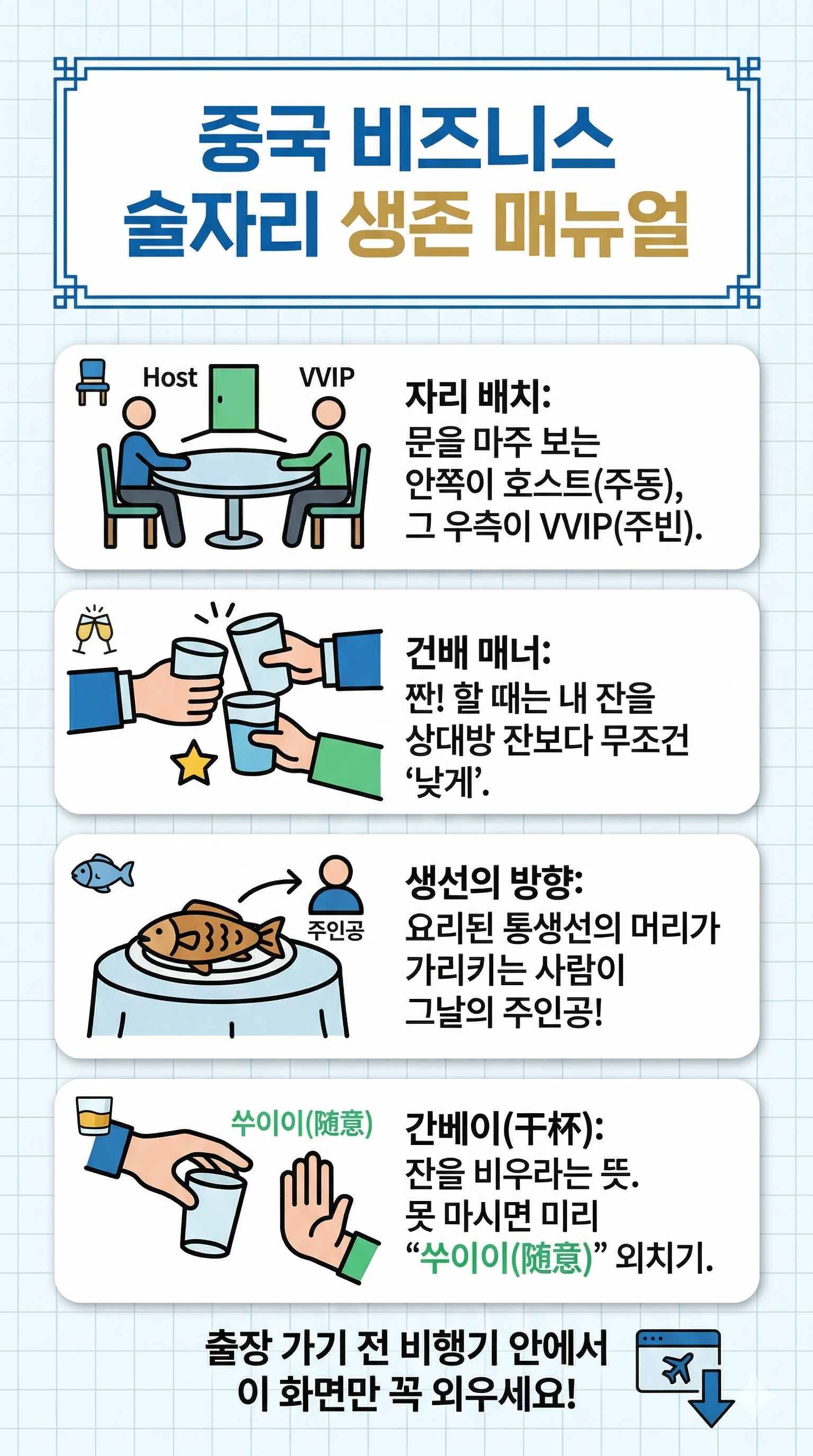 중국의 술자리는 철저한 위계질서와 상대방의 몐즈(체면)를 세워주는 암묵적인 룰이 존재합니다. 이 세 가지만 알아도 "한국에서 온 훌륭한 파트너"라는 찬사를 받을 수 있습니다.