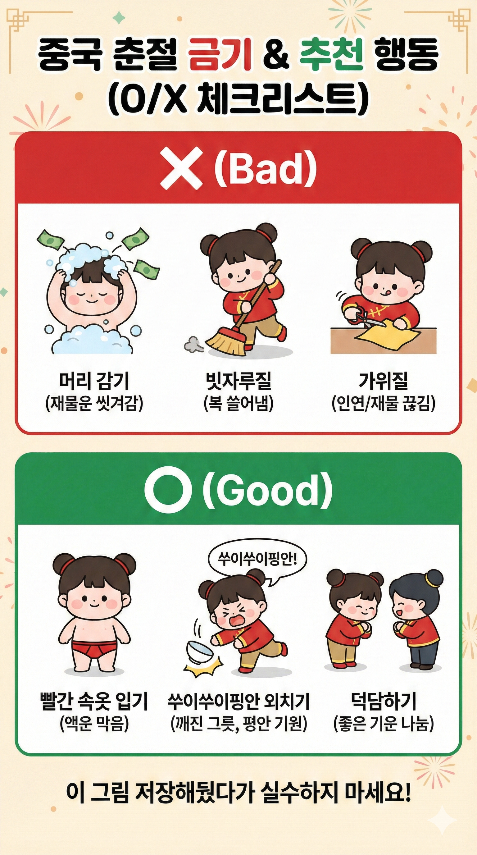 중국 춘절 금기 추천 행동 O X 체크리스트