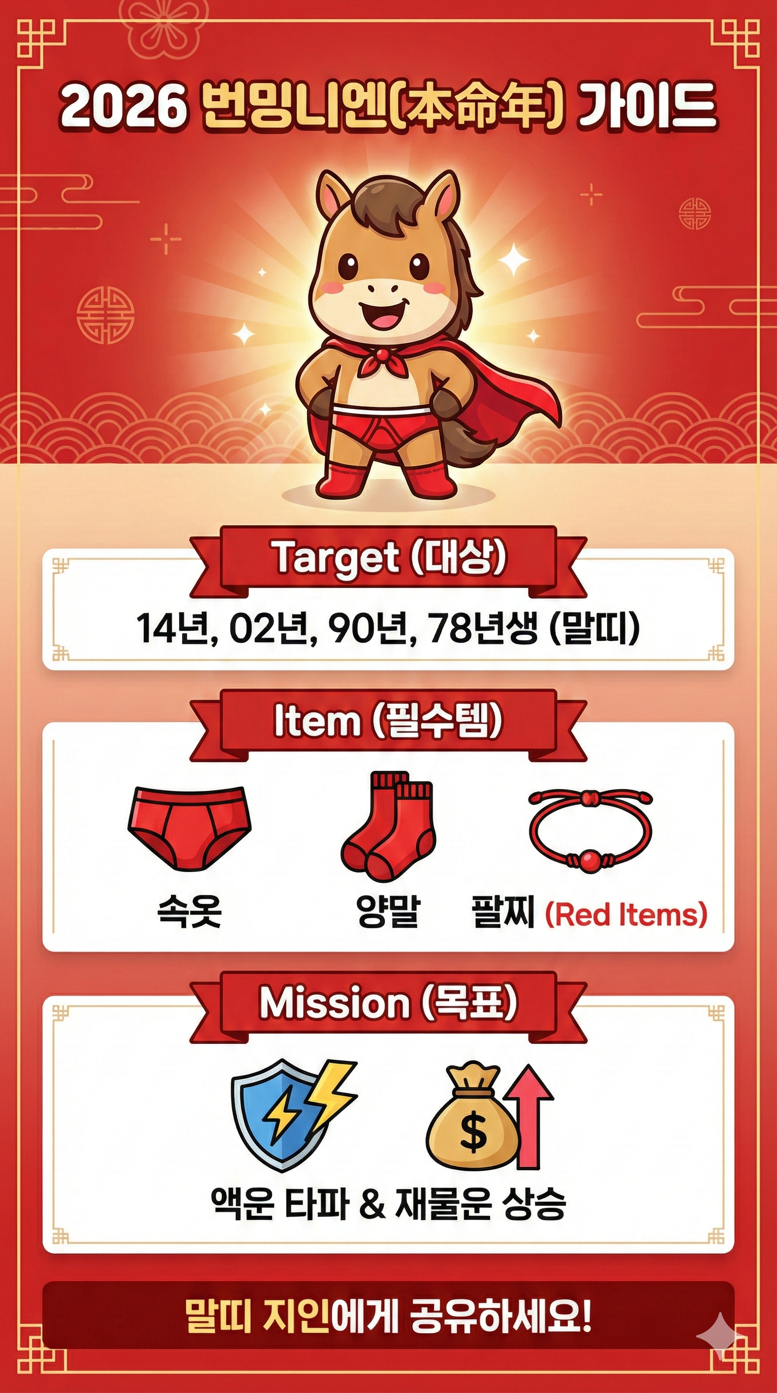 - 비즈니스 Tip: 거래처 사장님이 말띠라면? 고급 브랜드의 빨간 넥타이나 빨간 포장의 선물을 준비하세요. "번밍니엔이라서 준비했습니다"라고 한마디 건네면 계약 성사율이 올라갑니다.