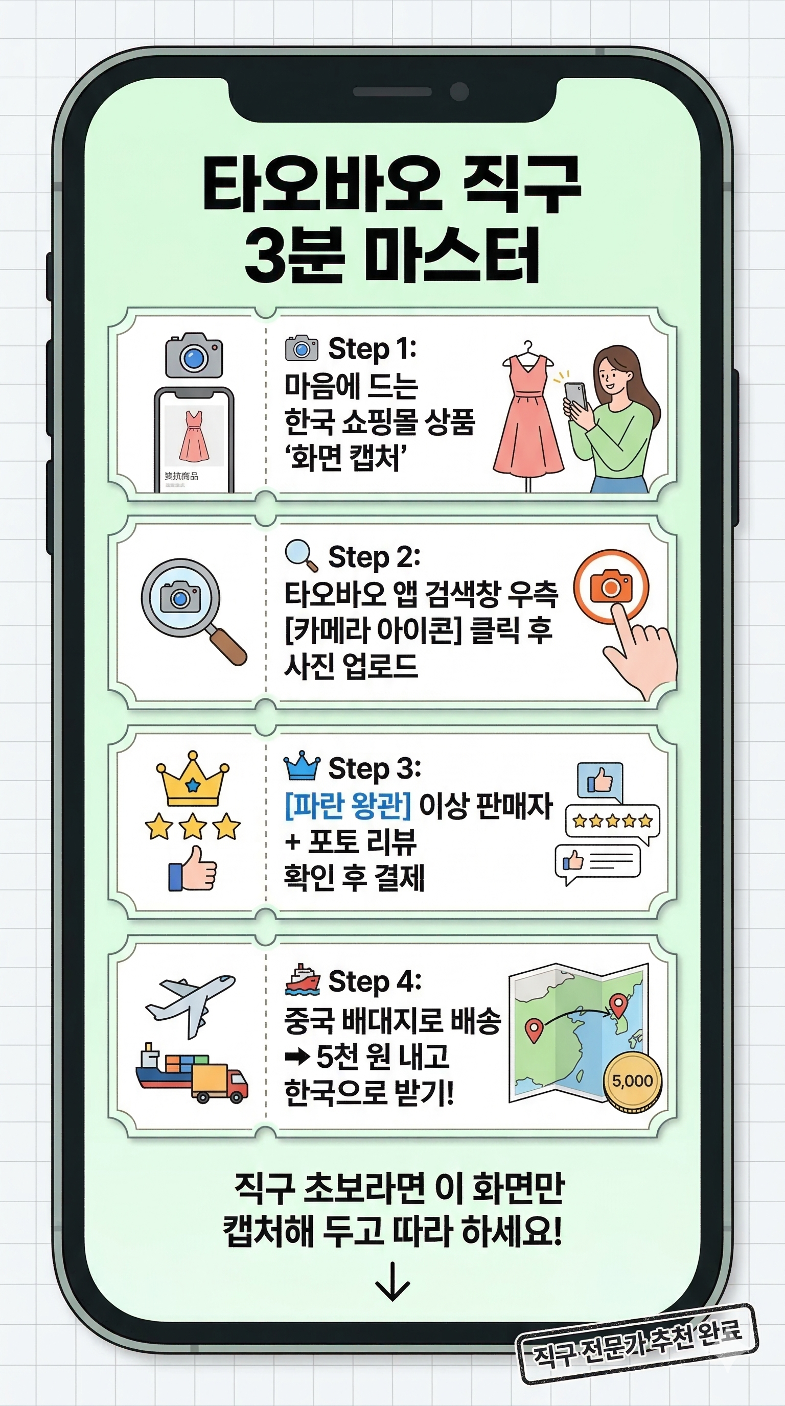 - 합배송의 묘미: A 상점에서 산 원피스와 B 상점에서 산 캠핑 랜턴을 배대지 창고에서 하나의 박스로 합쳐서(합배송) 한국으로 받을 수 있습니다. 이것이 직구의 진정한 묘미입니다.