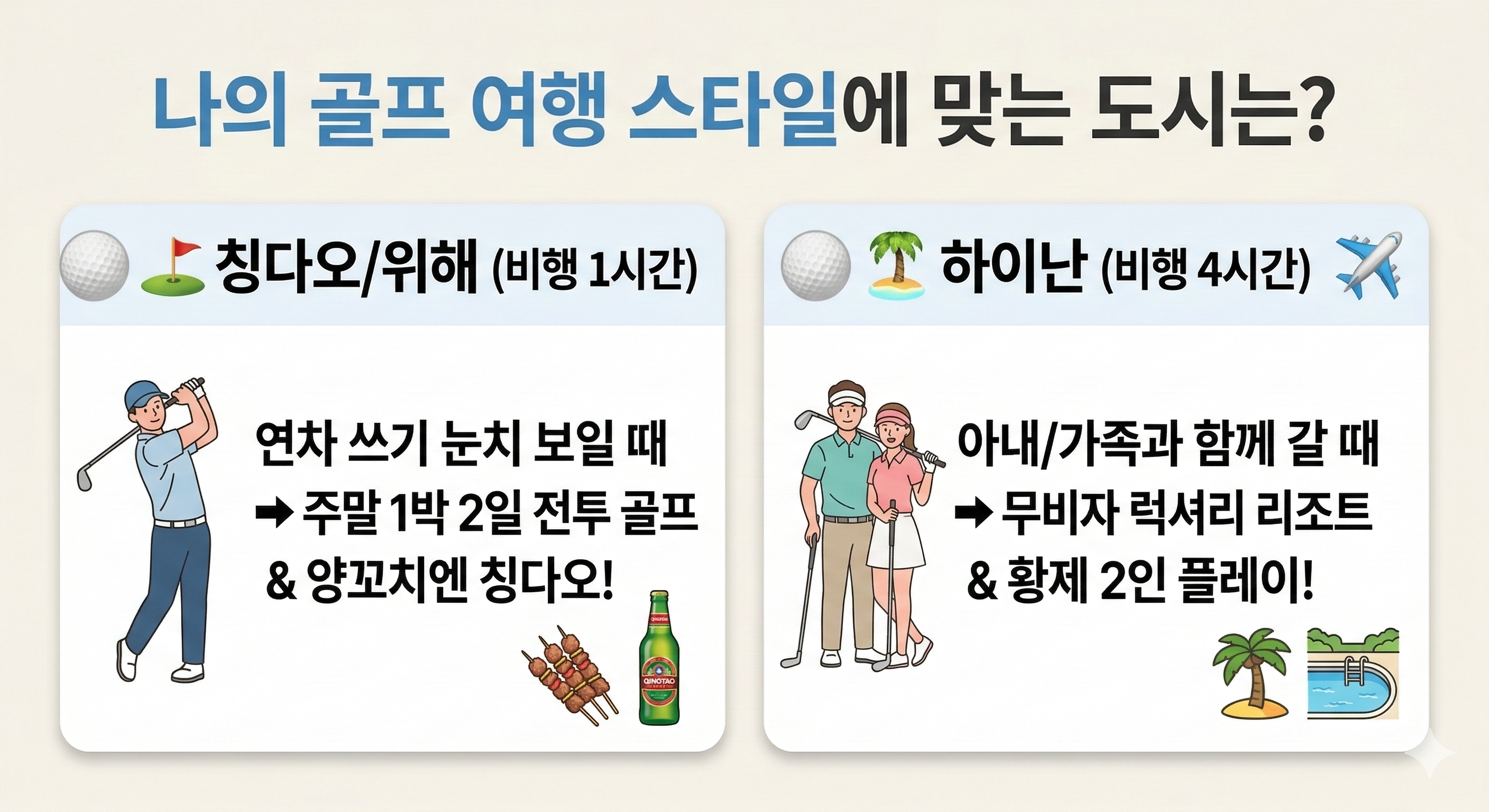 이번 주말, 동반자들과 함께 일정을 맞추고 항공권 검색부터 시작해 보세요. 가성비 넘치는 칭다오의 해변 코스든, 무비자로 떠나는 하이난의 럭셔리 코스든 2026년 올봄 여러분의 라운딩은 그 어느 때보다 여유롭고 짜릿할 것입니다.