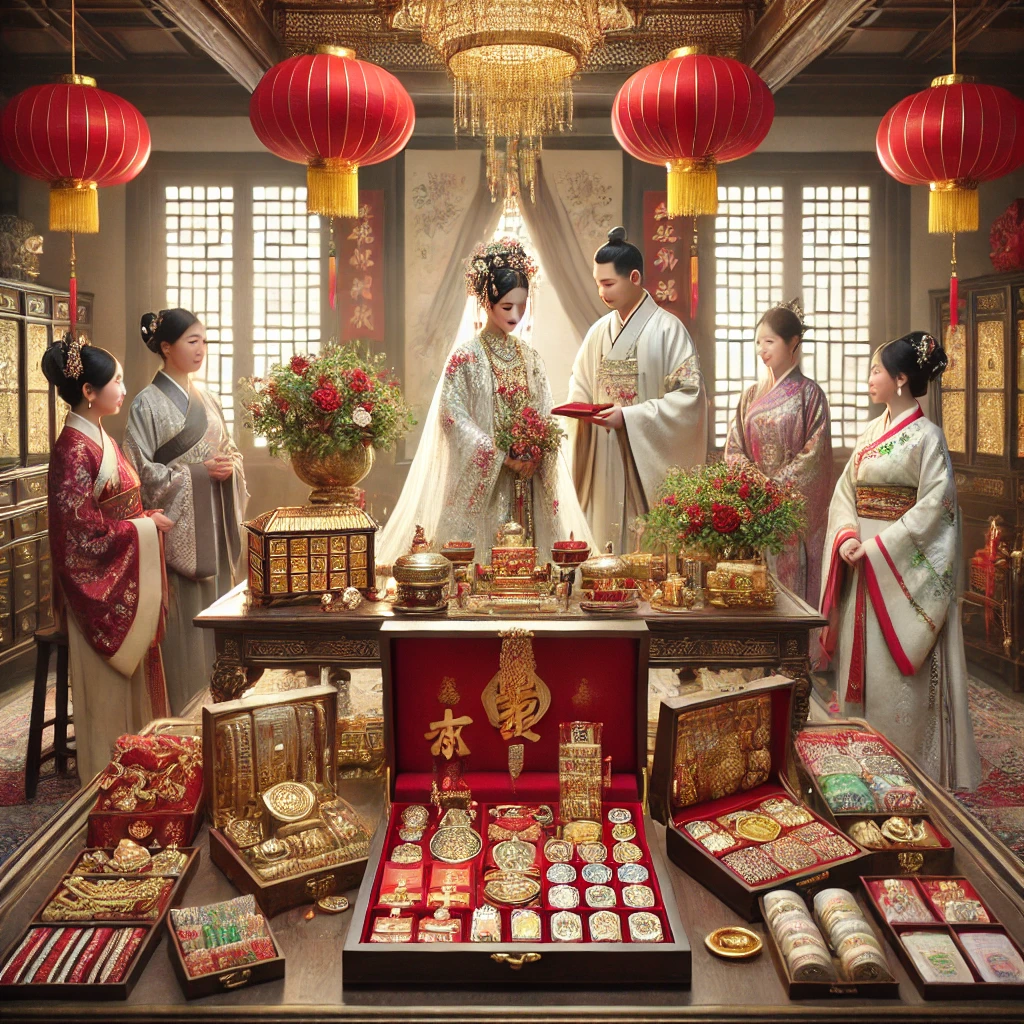 전통적으로 중국 결혼에서는 신부의 지참금뿐만 아니라 신랑 측에서도 예물을 준비합니다. 예물은 신부 측에 제공되는 결혼 선물로, 금, 은, 보석, 현금 등이 포함될 수 있습니다. 예물 교환은 결혼 준비 과정에서 중요한 의례 중 하나로, 양가의 결혼 의사를 공식적으로 확인하는 의미를 가집니다.