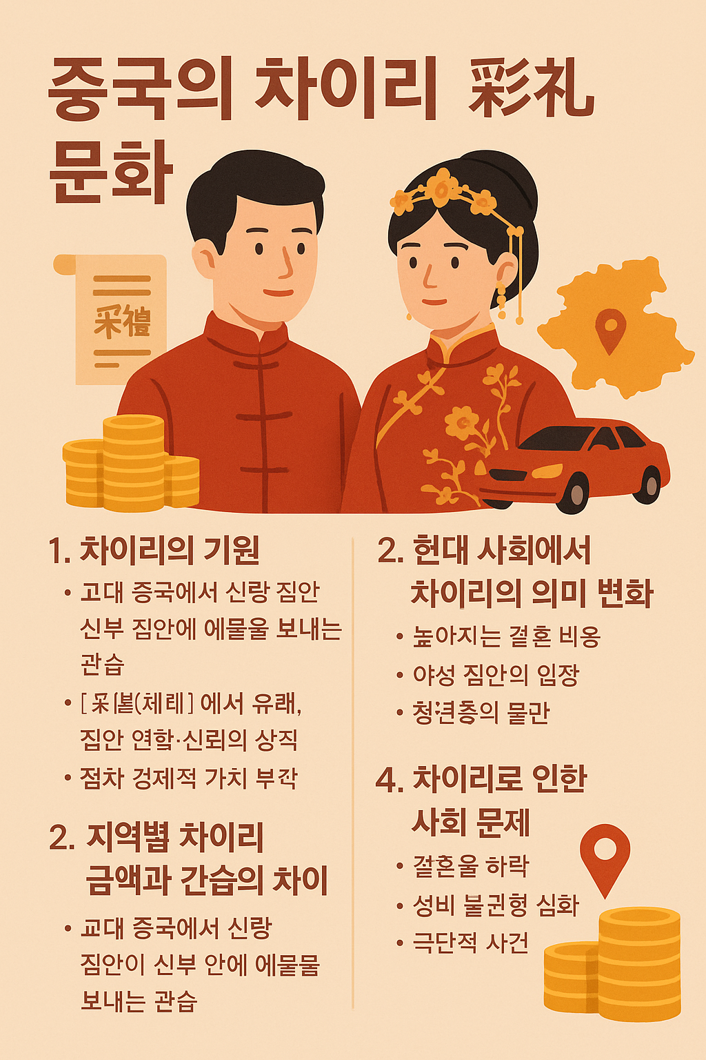 한국에서는 혼수와 예단, 예물을 주고받는 문화가 있지만, 중국의 차이리는 훨씬 더 경제적 부담이 크고 사회적 파장이 큰 현상으로 자리 잡고 있습니다. 오늘은 이 차이리 문화의 역사적 배경, 지역별 특징, 현대 사회에서의 변화, 그리고 최근 논란까지 깊이 있게 살펴보겠습니다.