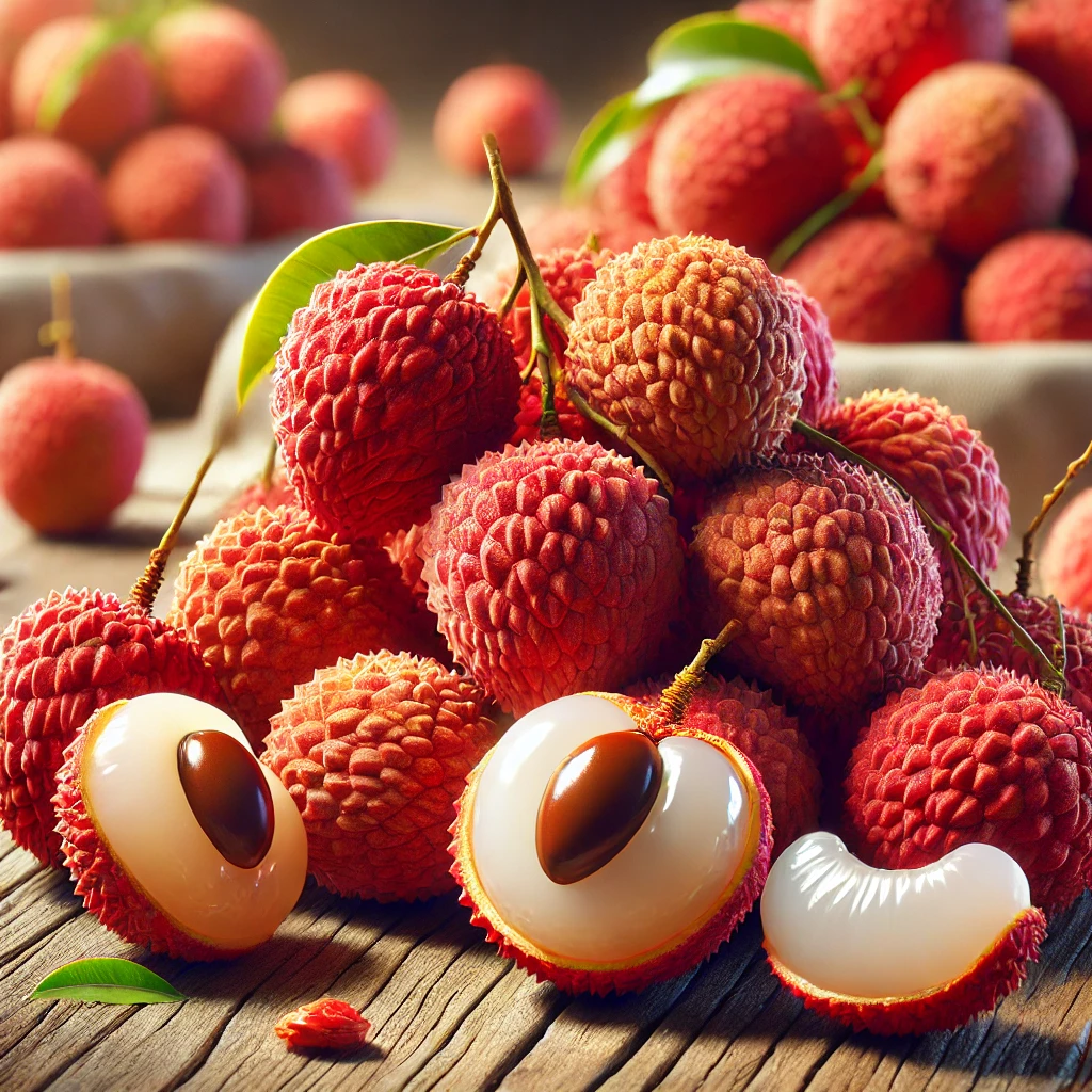 리즈는 껍질이 얇고 붉은 색을 띠며, 표면은 거친 돌기가 있습니다. 껍질을 벗기면 투명하고 하얀 과육이 나타나며, 속에는 하나의 큰 씨가 들어 있습니다. 리즈의 과육은 매우 부드럽고 과즙이 풍부하여 씹는 맛이 좋습니다. 이러한 독특한 외형은 리즈를 쉽게 식별할 수 있게 해주며, 그 아름다운 색상은 시각적으로도 매력적입니다. 리즈는 주로 여름철에 수확되며, 신선한 상태로 소비하는 것이 일반적입니다.