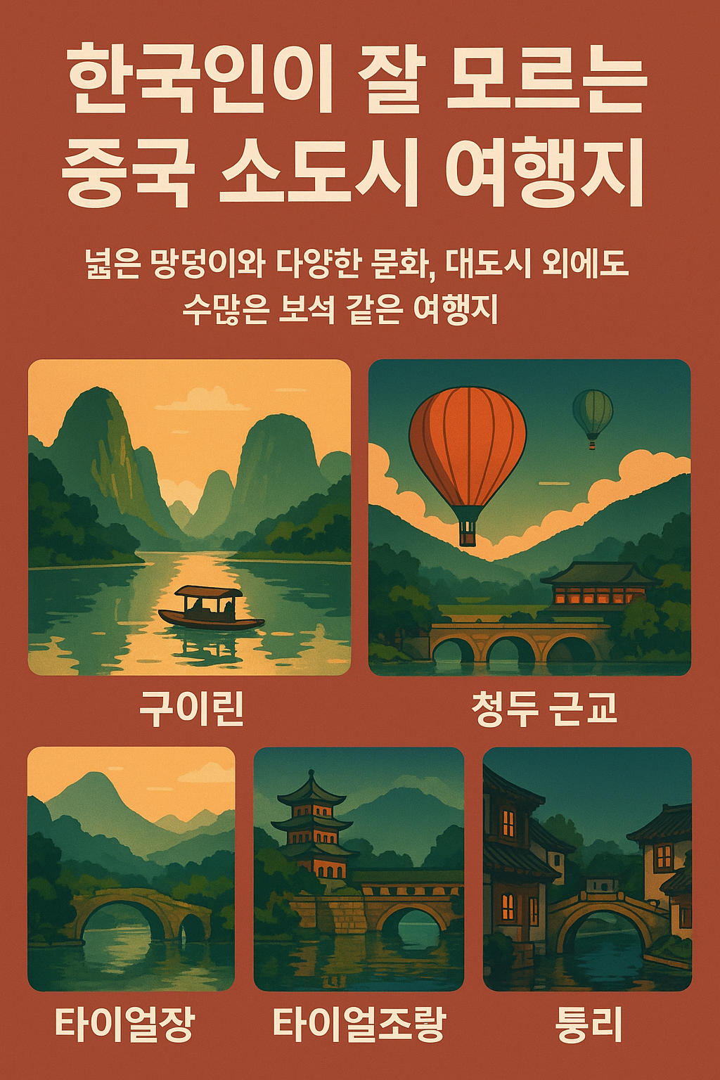 이번 글에서는 한국인이 잘 모르는 중국 소도시 여행지 TOP 5를 소개하며, 각 지역의 볼거리, 먹거리, 가성비, 치안까지 꼼꼼하게 살펴보겠습니다.
