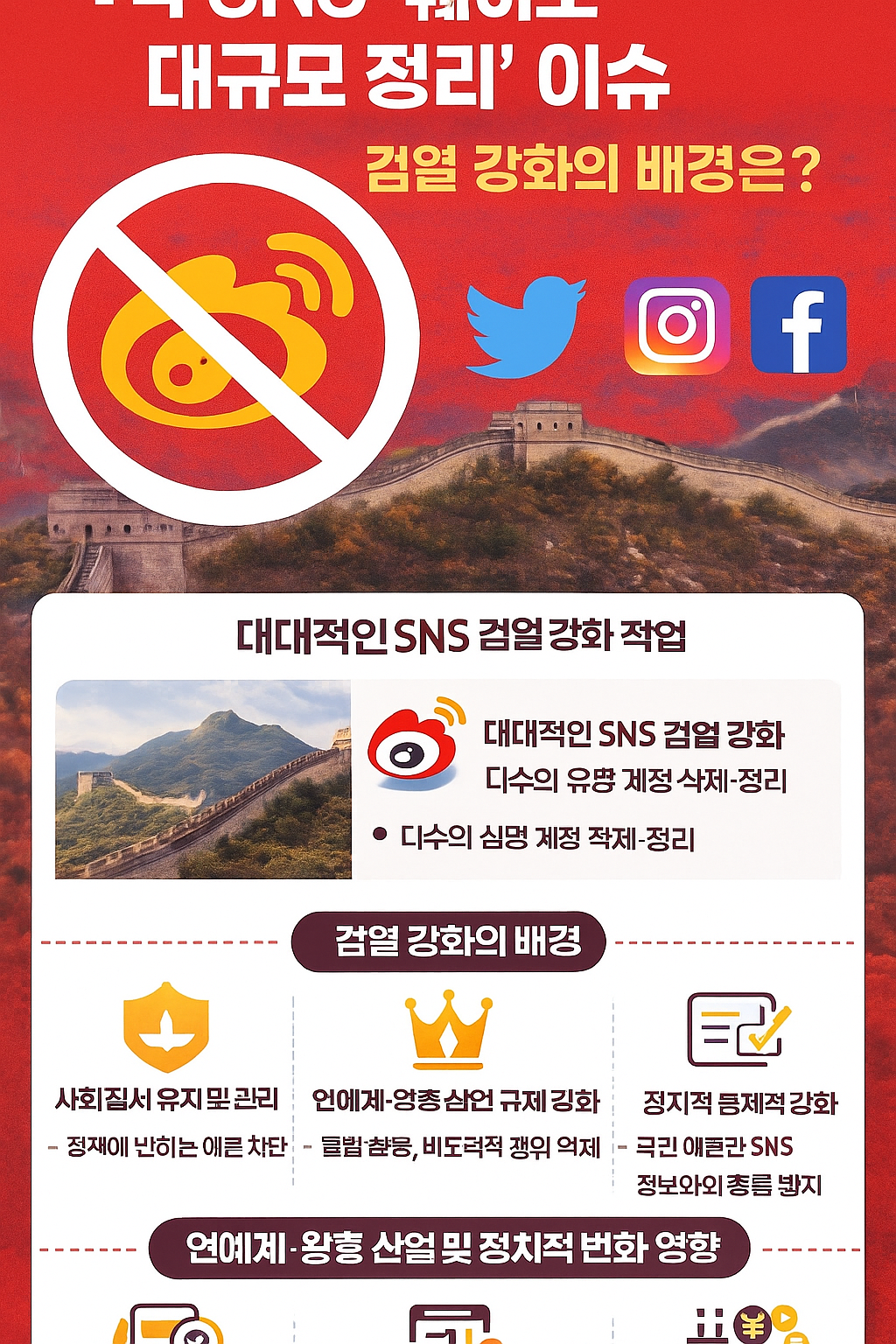 중국 SNS 웨이보가 최근 수십만 개에 달하는 계정을 한꺼번에 정리하며 ‘역대급 검열 강화’에 나섰습니다. 이번 조치는 단순한 계정 관리가 아니라 중국 공산당의 온라인 여론 통제 방향성 변화를 그대로 드러낸다는 점에서 중국 내부는 물론, 한·중 연예 산업과 크리에이터 시장에도 큰 영향을 끼치고 있습니다.