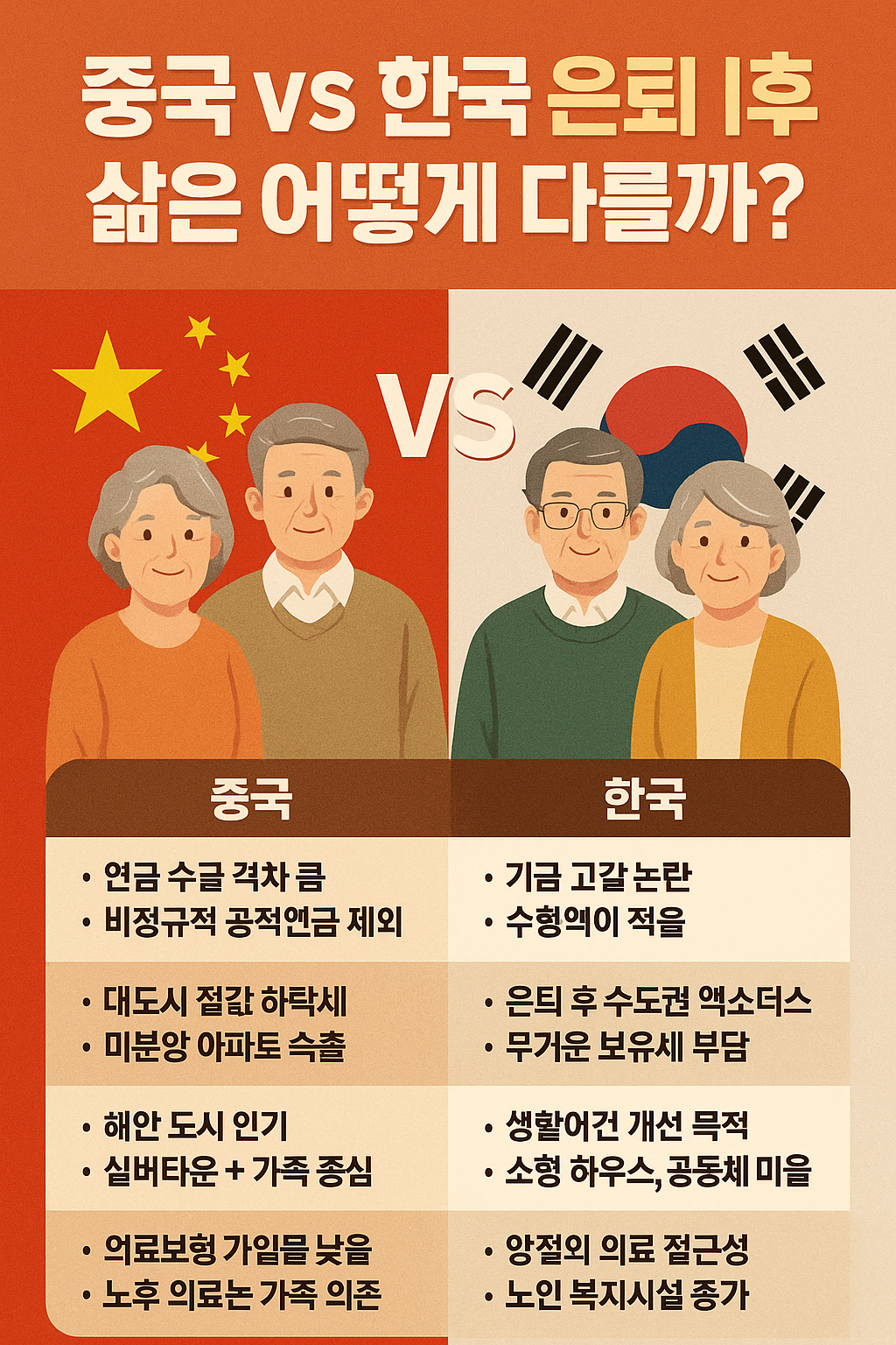 을 중심으로 중국 vs 한국 은퇴 이후 삶을 비교해 봅니다.