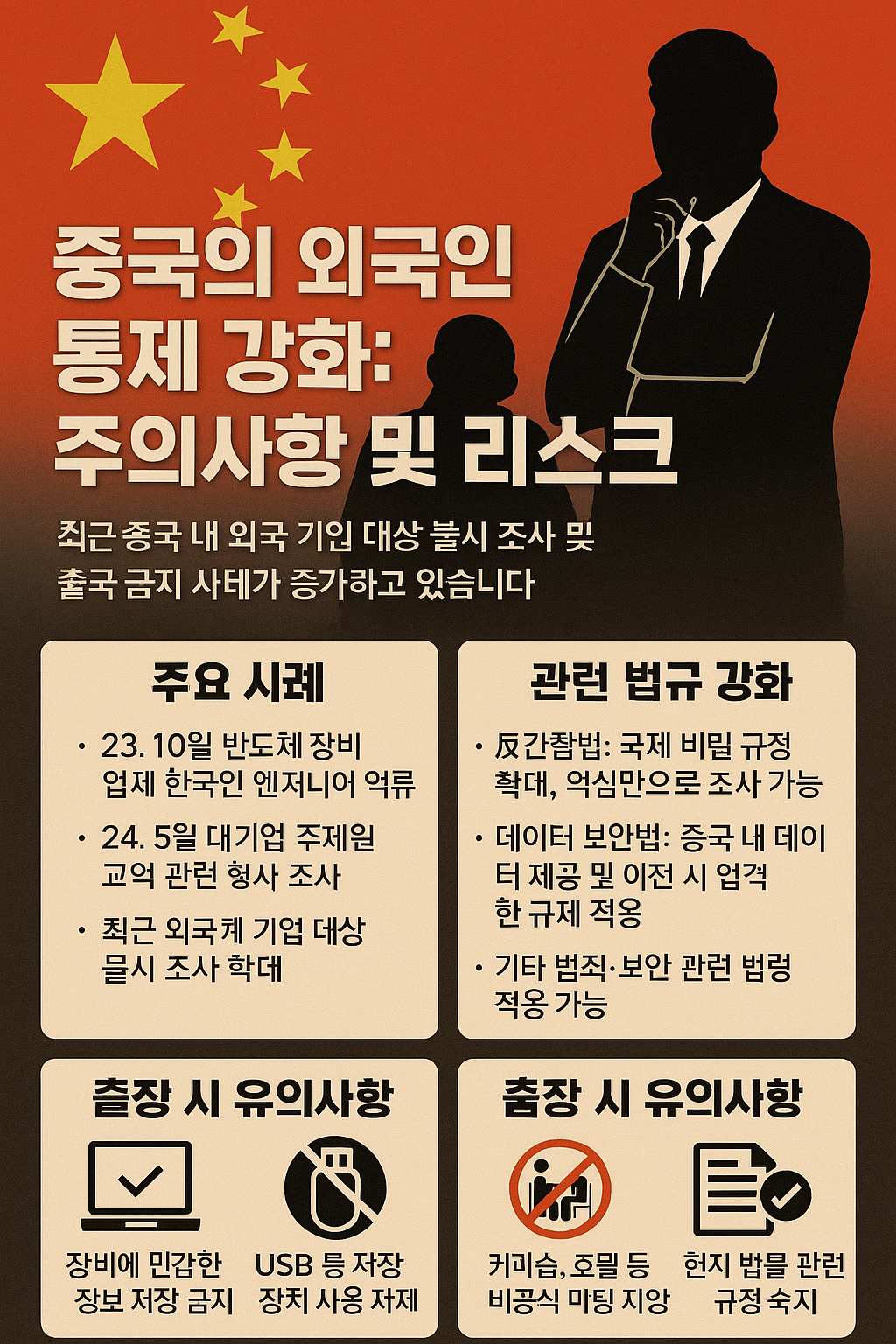 이 글에서는 중국 내 외국인 통제 강화의 배경과 최근 사건, 그리고 한국인 실무자가 반드시 알아야 할 출장 시 유의사항을 실무 중심으로 정리했습니다. 중국과의 무역, 비즈니스, 주재 근무 등을 계획하고 있는 분이라면 반드시 확인하시기 바랍니다.
