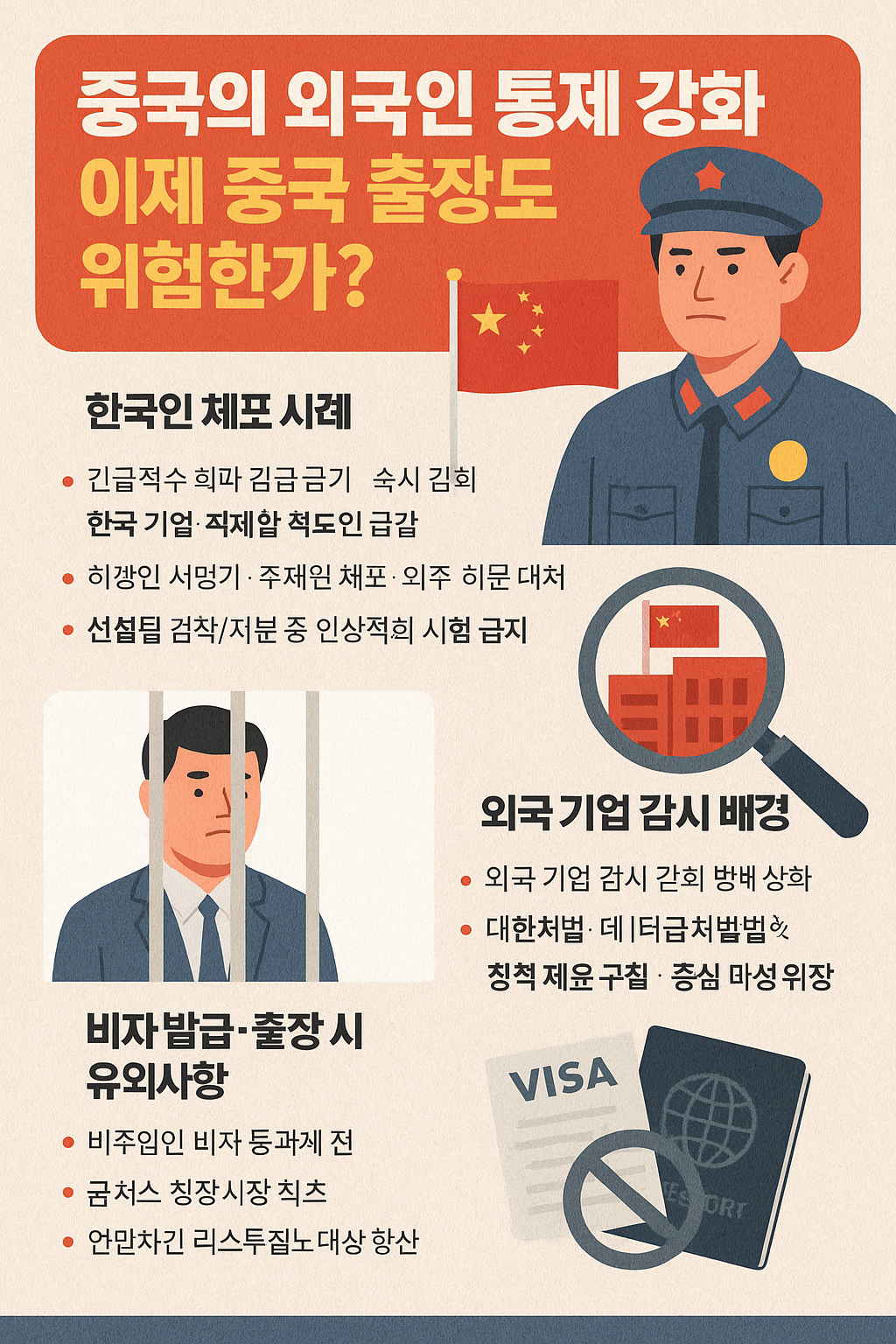2025년 현재, 이 질문은 더 이상 과장이 아닙니다. 최근 중국 내에서 외국 기업 대상의 불시 조사, 한국인 주재원 체포, 외국인 억류 사례가 잇따라 보도되면서, 단순한 해외 출장이 국가 리스크로 전환되고 있습니다.